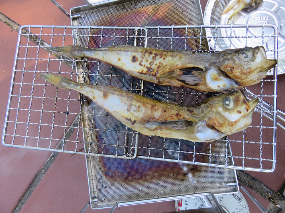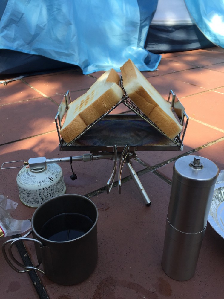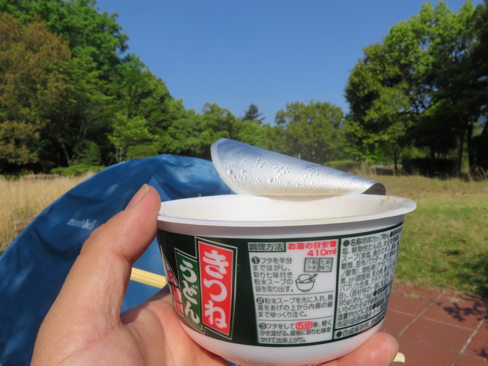 前日の「十神山なぎさ公園」近くの食品店で手に入れたカップ麺とパンと干物で朝飯