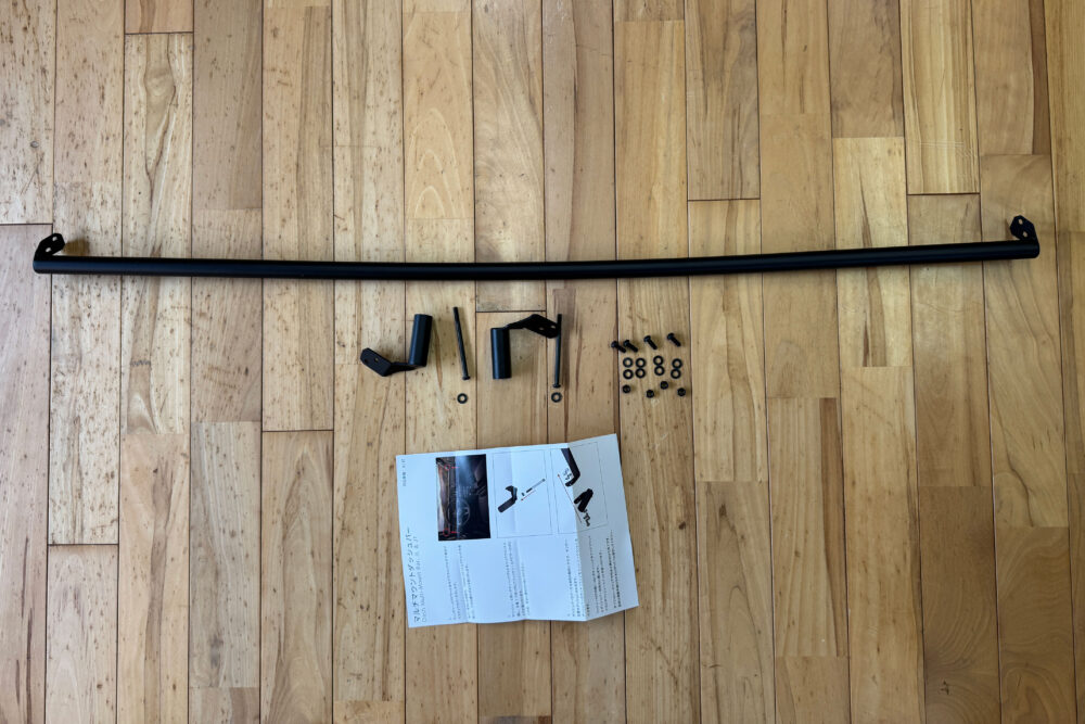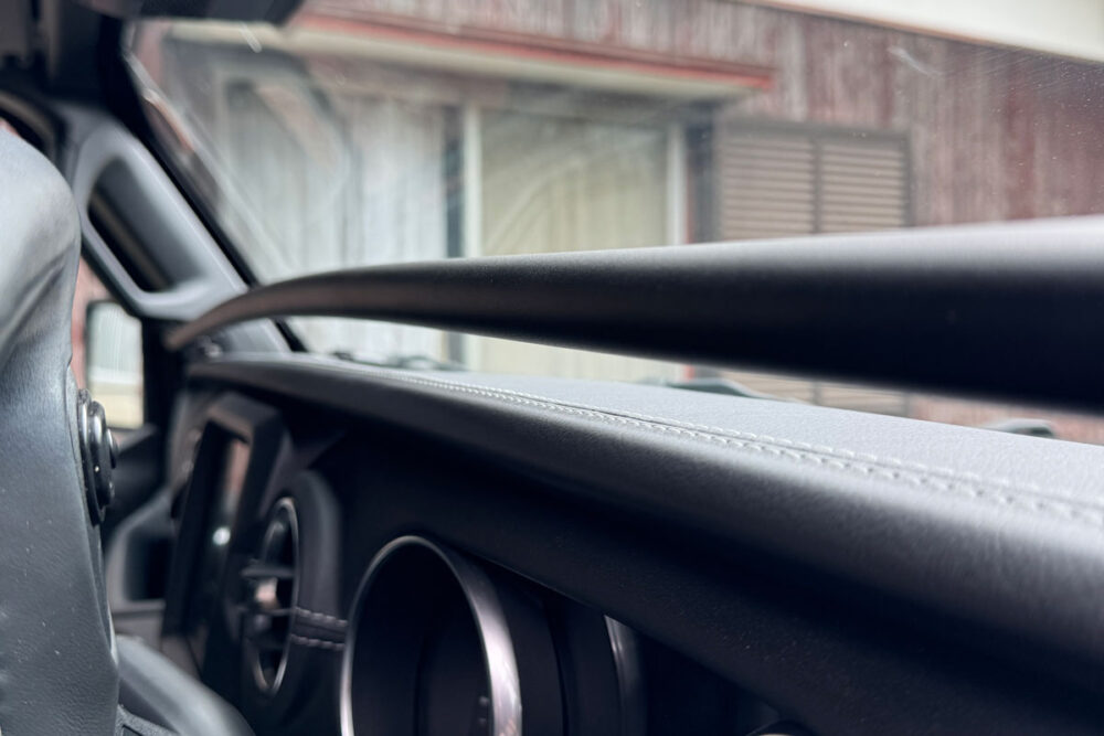 この角度で撮影するとダッシュボードとダッシュバーの隙間が均一でかっこいいのだけど、実際は下の写真のように、中央部のパイプが山なりになっていてカッコ悪い