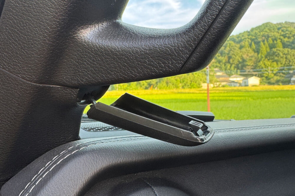 右の金具とダッシュボードンボクリアランスは問題ないけど、左の金具とダッシュボードとのクリアランスが2mmほどしか確保できないので養生して作業しないとダッシュボードに傷が入りそうです。初期不良かなとネットを探すと、皆んな同じ感想が多いみたいだから製造元には改良して欲しい所です。削る工具を持ってるならグラブバーに差し込んだパイプを2mm削ってクリアランス確保したい。